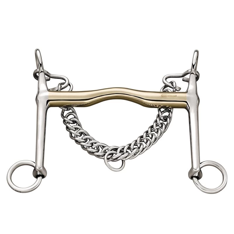 The HS Long Cheek 16mm Sensogan Weymouth Bit features a straight bar with a slight port so not contact is pressured to the sensitive palate. Rather, steady and even pressure is transmitted onto the whole tongue-width. This bit is a good choice for horses with a flat palatal arch. Higher poll pressure is applied with 7 cm cheeks causing the leverage effect to be slightly delayed. The leverage effect sets in more directly with 5 cm cheeks. Additionally, the mouthpiece is made of Sensogan. Developed by SPRENGER, Sensogan is toxicologically tested, has a high compatibility and is exceptionally well tolerated. Furthermore, the Sensogan mouthpiece is easy to clean and results in a consistent flow of saliva promoting bit acceptance.