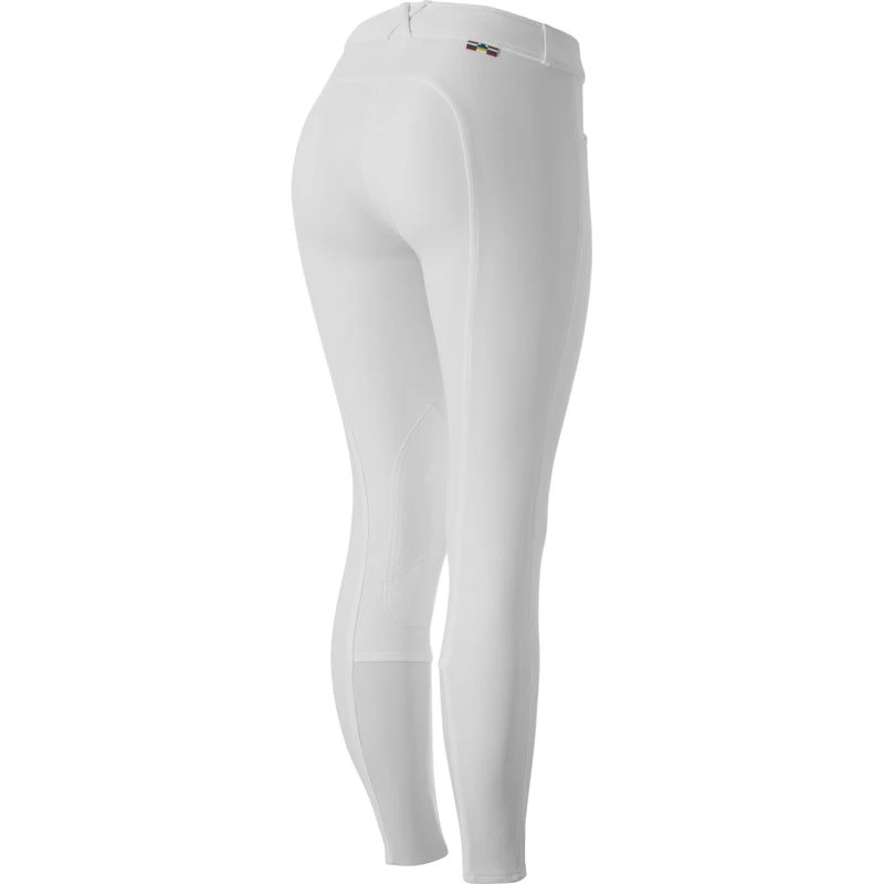 Made from comfortable stretch fabric, these breeches offer a traditional, elegant style that’s perfect for the show ring. The simple leather-like knee patch adds secure grip and a polished look while the lower elastic leg bottoms actually stay in place under your boots without feeling bulky. The rear silhouette of these breeches is clean without the interruption of back pockets. The Women’s Grand Prix Knee Patch Breeches by Horze feature water and dirt repellent material that is UPF 50+ UV protected.