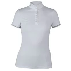 This stretch show shirt features a button tab front closure with tab collar. It is short sleeved, ideal for hot summer show days. The lightweight stretch fabric is form fitting, so it is smooth under your show coat. Colors have contrast white, or opt for the solid white version.
